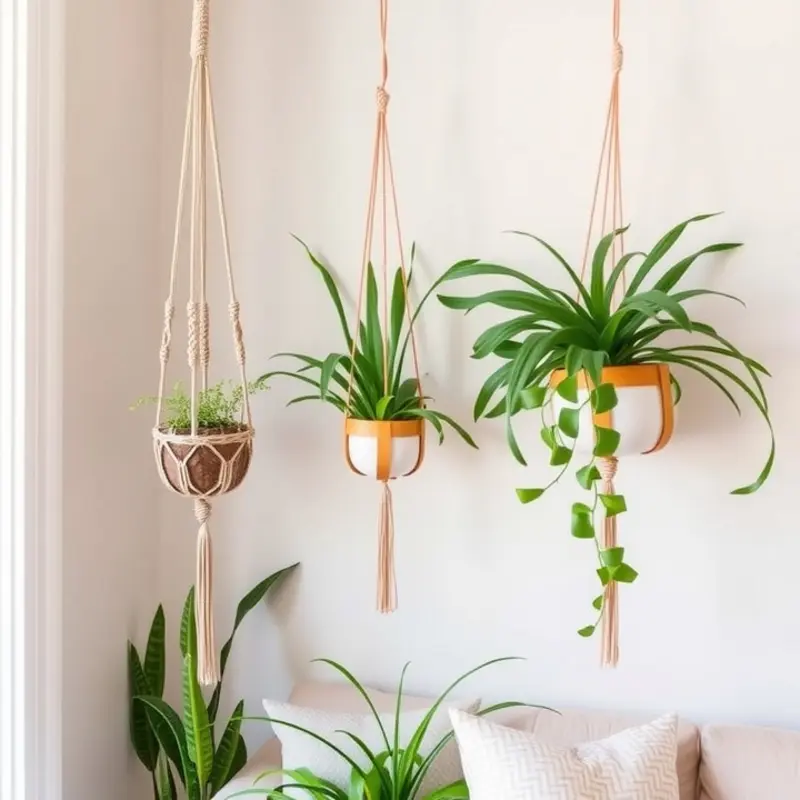 If floor space is limited, consider utilizing ceiling hooks coupled with planter bowls. This approach keeps the room feeling airy and uncluttered. Coconut or bamboo planter bowls add an additional layer of aesthetic appeal. For a dynamic display, mix plant varieties like spider plants and cascading ivy, bringing vitality to an overhead vista.
